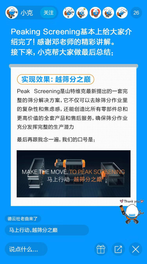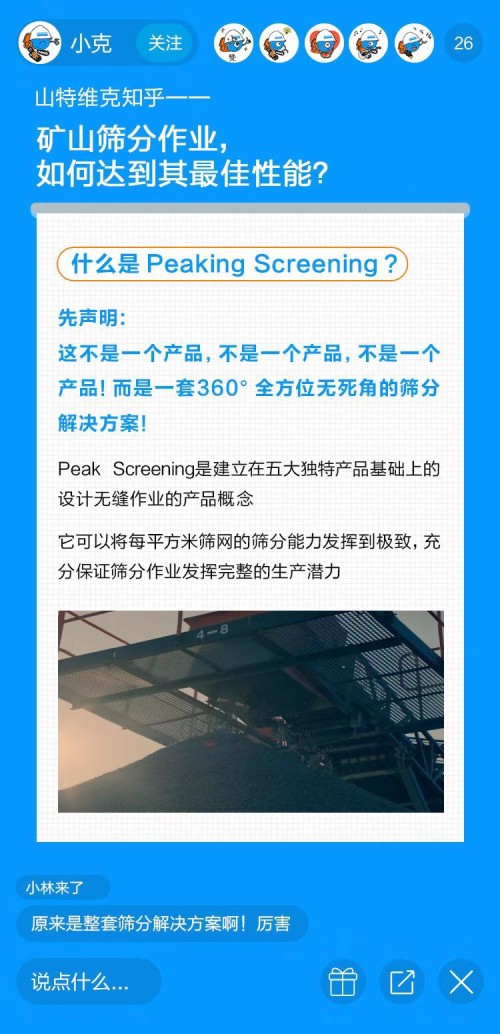 今天的直播課就請(qǐng)他,為大家講講礦山開采中一個(gè)重要環(huán)節(jié)——篩分。要知道篩分性能不佳會(huì)給開采商帶來不可預(yù)估的損失,比如成本的增加、利潤(rùn)的下降,那你知道如何解決礦山篩分作業(yè)中的痛點(diǎn),從而實(shí)現(xiàn)產(chǎn)能最大化么?今天我們就以山特維克Peaking Screening篩分解決方案為例,看看如何做到「越篩分之顛」!